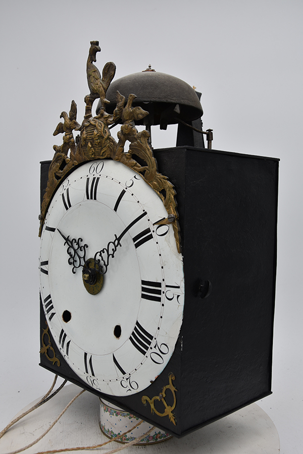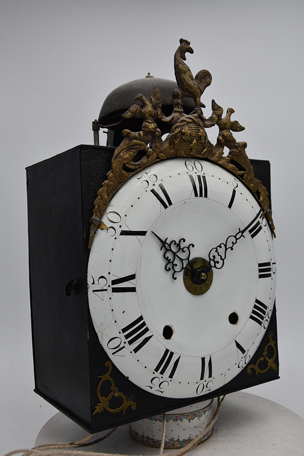 Prachtige schotelhaan uit de tijd rond 1770-1780. Supergave schotel. Wekker compleet.Originele deuren en achterwand. Compleet met gewichten en slinger ophangbeugel en sleutel. Klok loopt perfect, een schoonmaakbeurt is aan te bevelen. Prijs indicatie 650 euro.