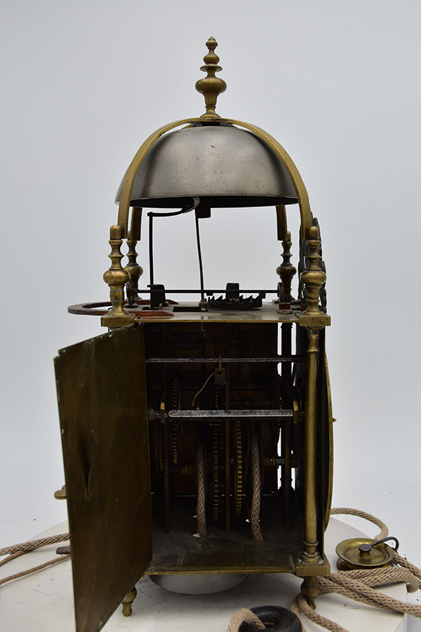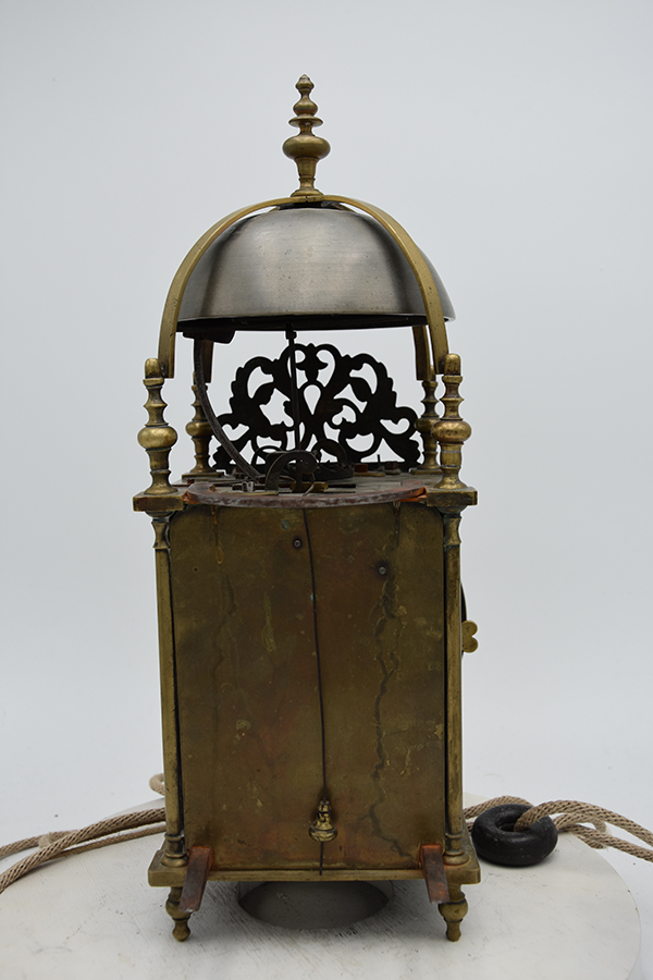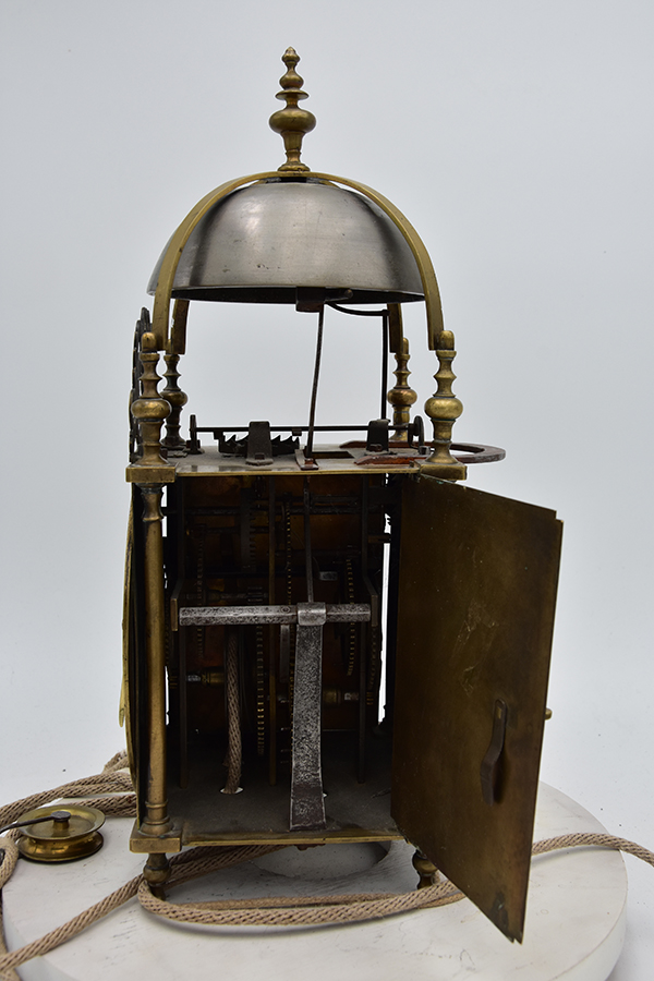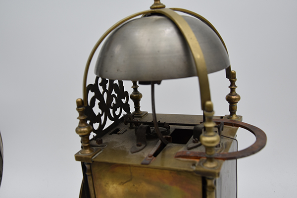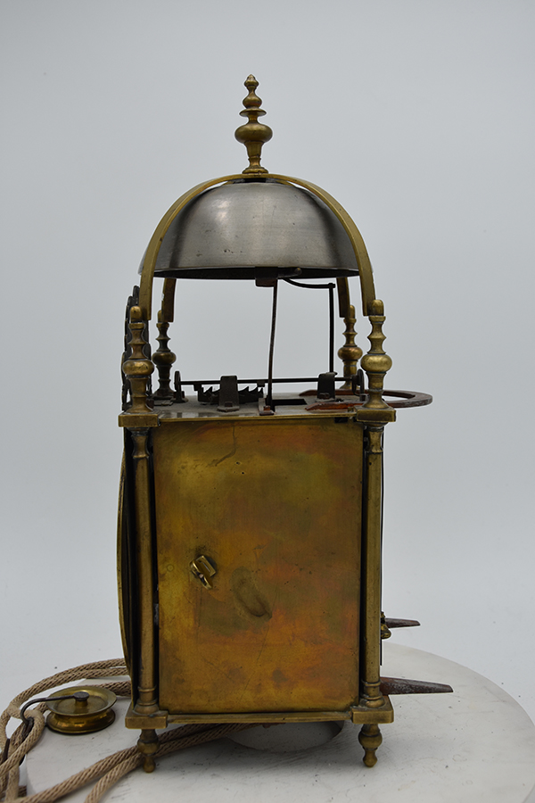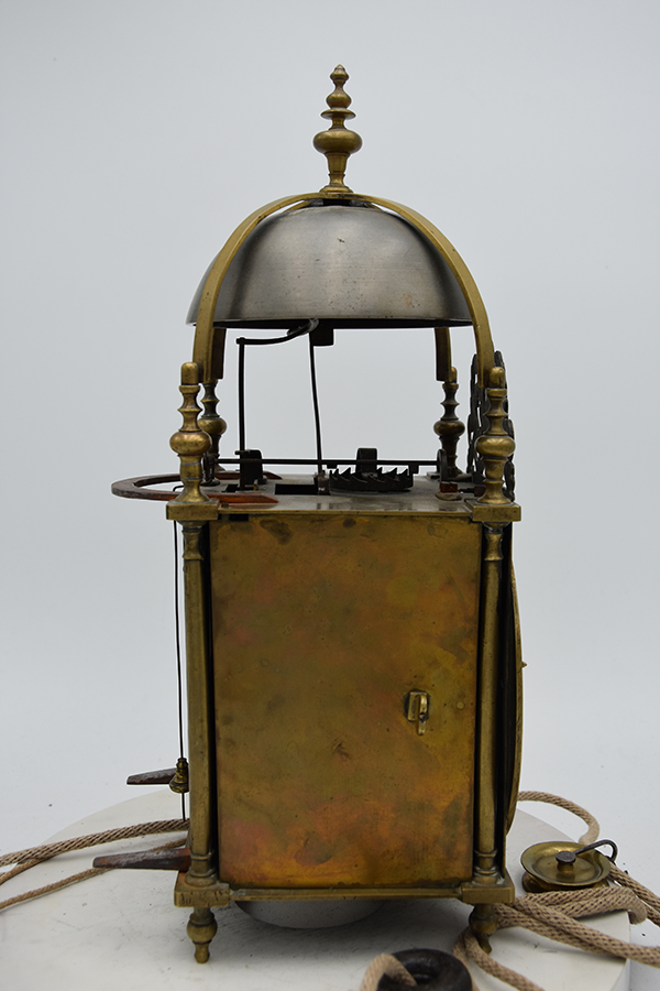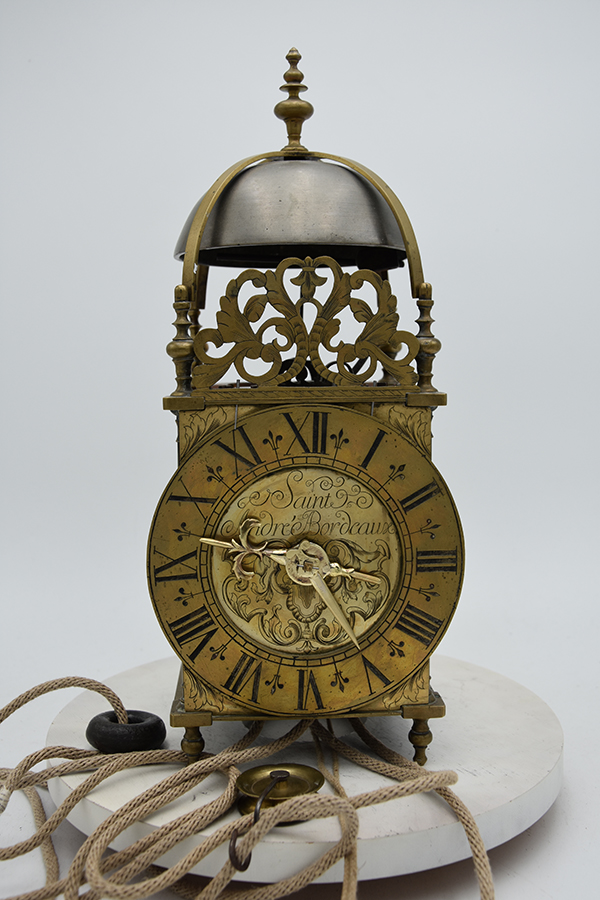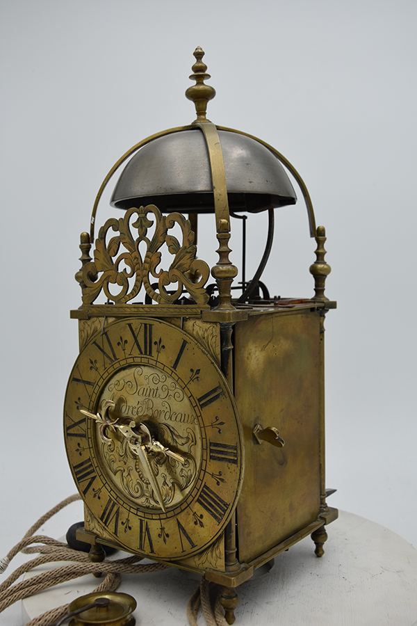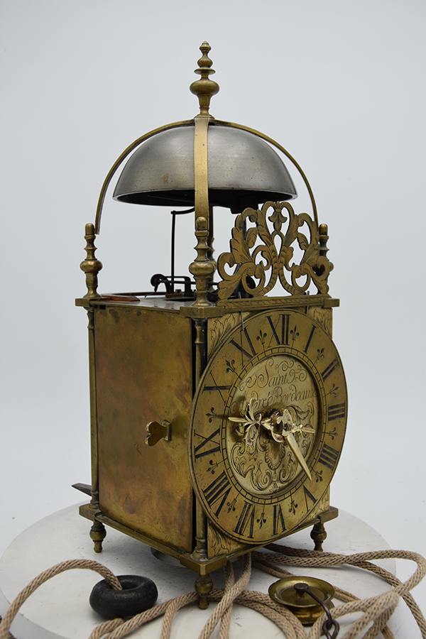 Prachtige vroege Franse lantaarnklok uit de 18e eeuw, met wekkerfunctie en nog in originele staat. De wekker bevindt zich in de kast en niet erbuiten. Compleet met gewichten, inclusief wekkergewichten. De fret is prachtig gegraveerd, evenals de binnenspiegel. Gesigneerd met Saint André à Bordeaux. Volgens Tardy was deze naam een pseudoniem; de echte naam van deze klokkenmaker is Michel Bernard, geboren in 1689 en overleden in 1765. Deze klok heeft geen wekkerschijf maar een wekkerwijzer, wat zeer bijzonder is. De wekkerwijzer is ooit gebroken geweest en later gerepareerd. Deze klok is ook te koop. Prijs op aanvraag.