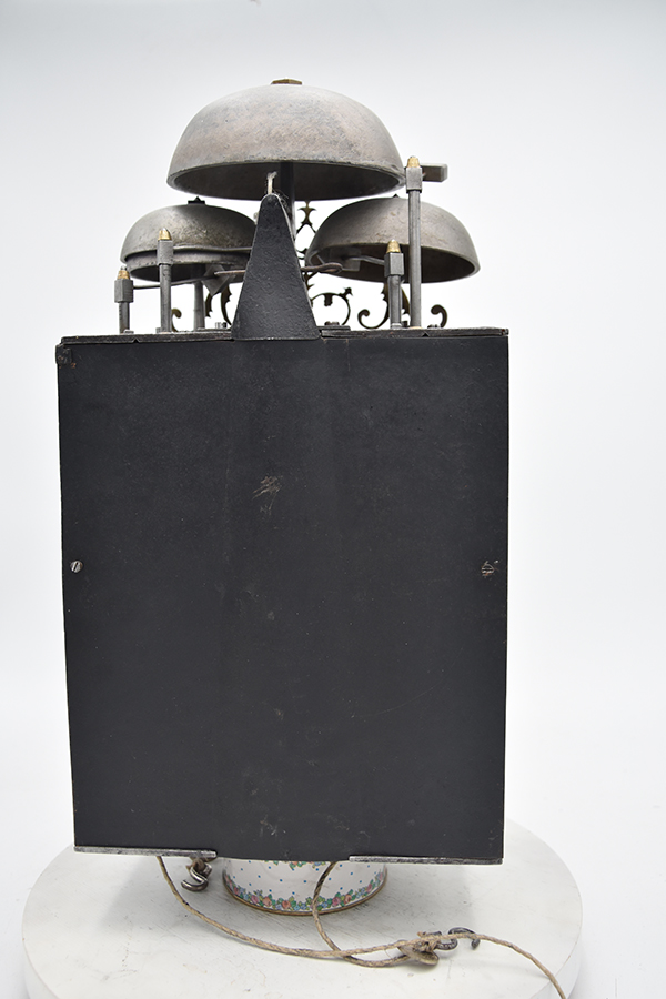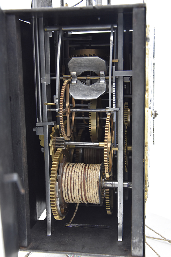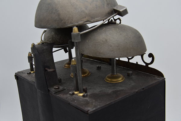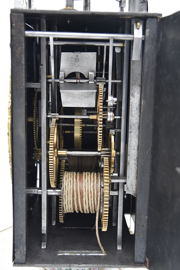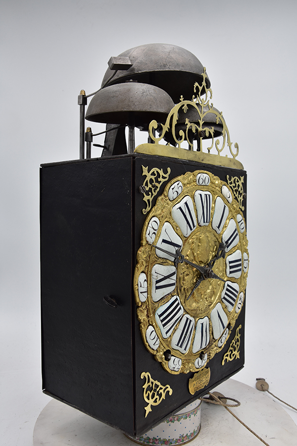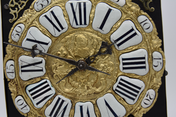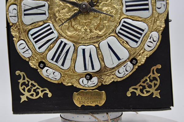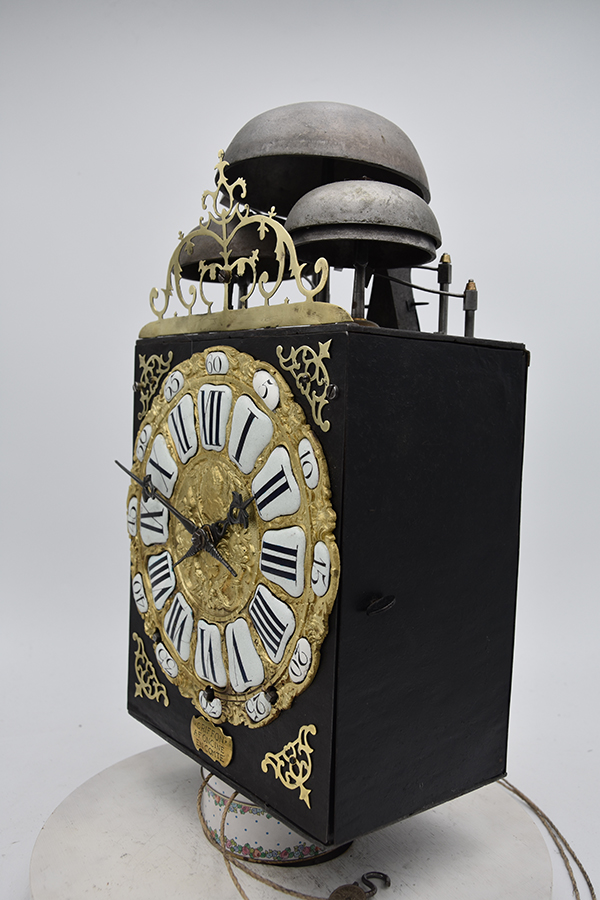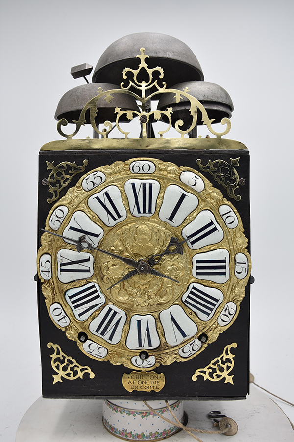 Een kleine Vroege gesigneerde cartouche 4 beller uit de tijd rond 1750-1760. Klok is slechts 20.5 cm breed. 4 bellers in deze vorm zie je niet vaak. Gesigneerd met Griffon a Foncine en Comte. Mooie originele klok compleet met zijn gewichten slinger en sleutel. Zware kwaliteitsklok met prachtige ijzeren wijzers. en schiterende hoekstukken Pure verzamelaarsklok. Petit sonnerie. Hogere prijsklasse