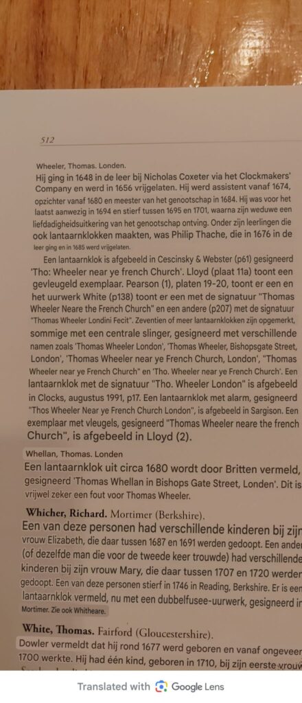 De klokkenmaker Thomas Wheeler is te vinden de boeken van Loomes en White.
