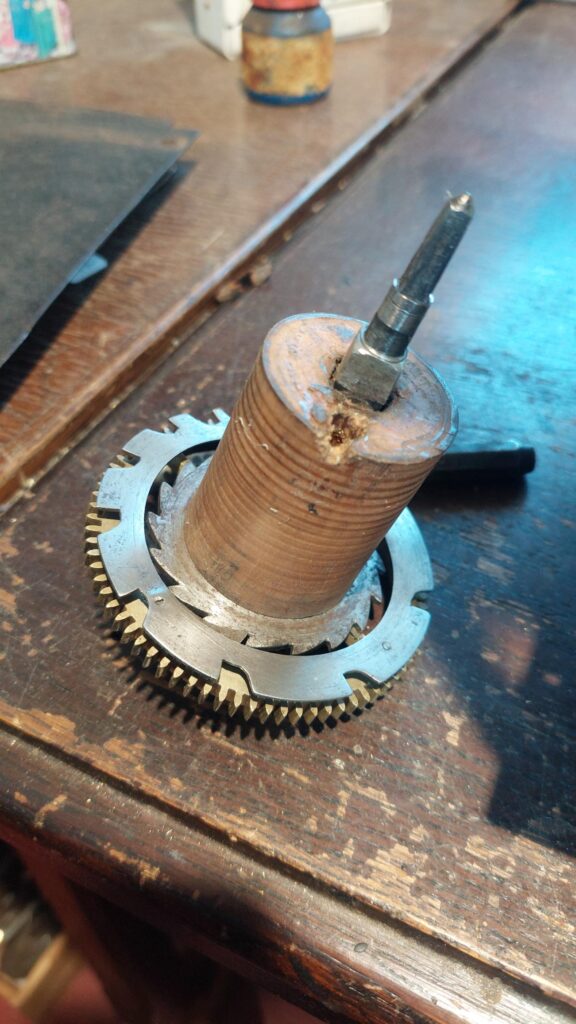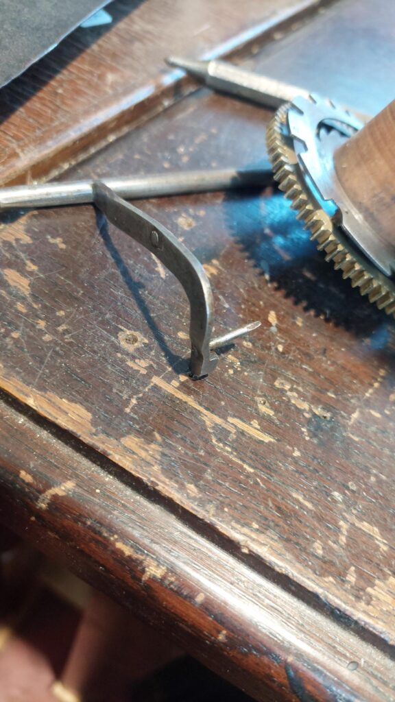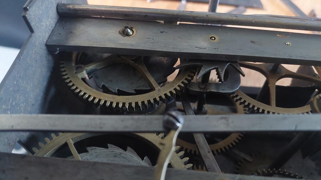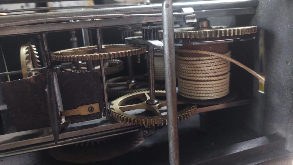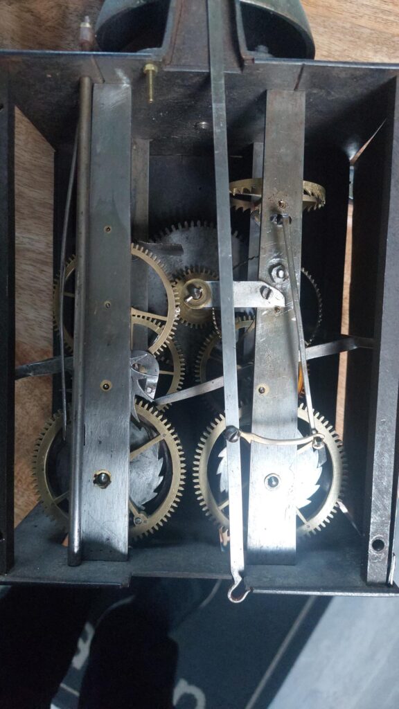 Klokje heeft nog zijn originele slinger en sleutel met bijpassende gewichten. Klok heeft een zwaar uurwerk met een afwijkend slagwerk. zie foto’s, sluitschijf op grondrad gemonteerd.. Exact hetzelfde als bij de klok die in het boek staat vermeld van Sigfried Bergmann.